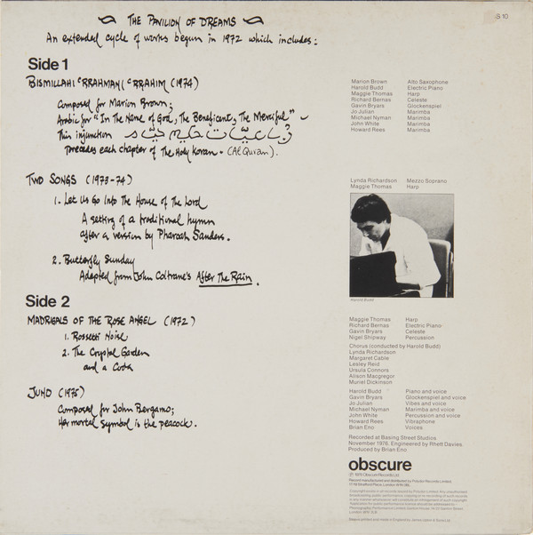 Obscure Records was a UK label created and curated by Brian Eno that existed only from 1975 to 1978. Ten albums were issued in a series, each with virtually the same cover art – a darkened photograph of buildings with different areas of the image emphasized by lightened squares, the artist’s name and album title in the upper left. Eno’s own album, Discreet Music (1975), was released third in this series (Obscure no. 3); Michael Nyman’s Decay Music (1976) was sixth (Obscure no. 6) and Budd’s The Pavilion of Dreams, the tenth and last (Obscure OBS-10).