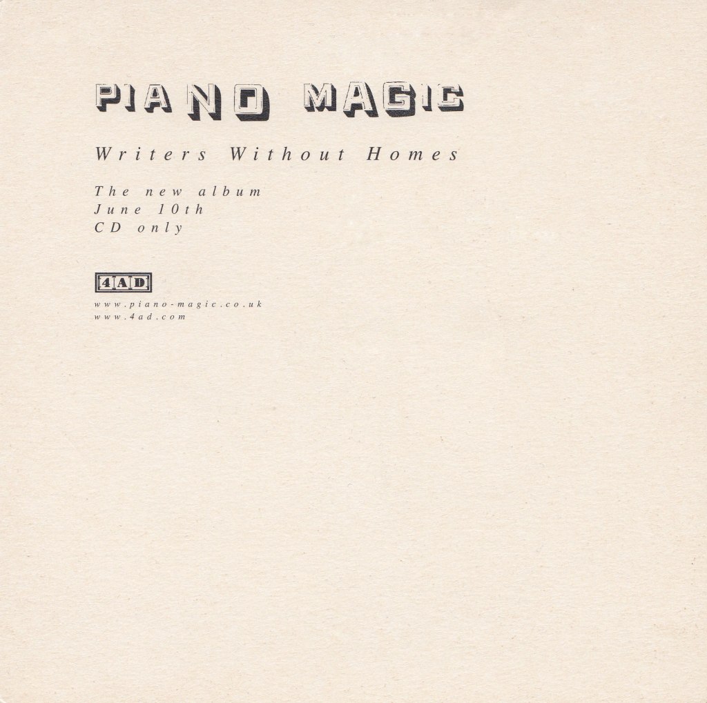 Paul Anderson of Tram, who we’d often bump into touring the same Spanish festivals and London venues, took the lead vocal. His voice, the perfect balance of woe and loss, was tailor-cut for Piano Magic. Paul also sang on the album’s title track, ‘Writers Without Homes,’ a song eventually rejected by 4AD, as were two or three others, including ‘The 17th Time’ with Darren Hayman of Hefner, with whom we’d also play live with a lot around this time. The latter was released only as a track on the cover-mount CD of a Spanish magazine.