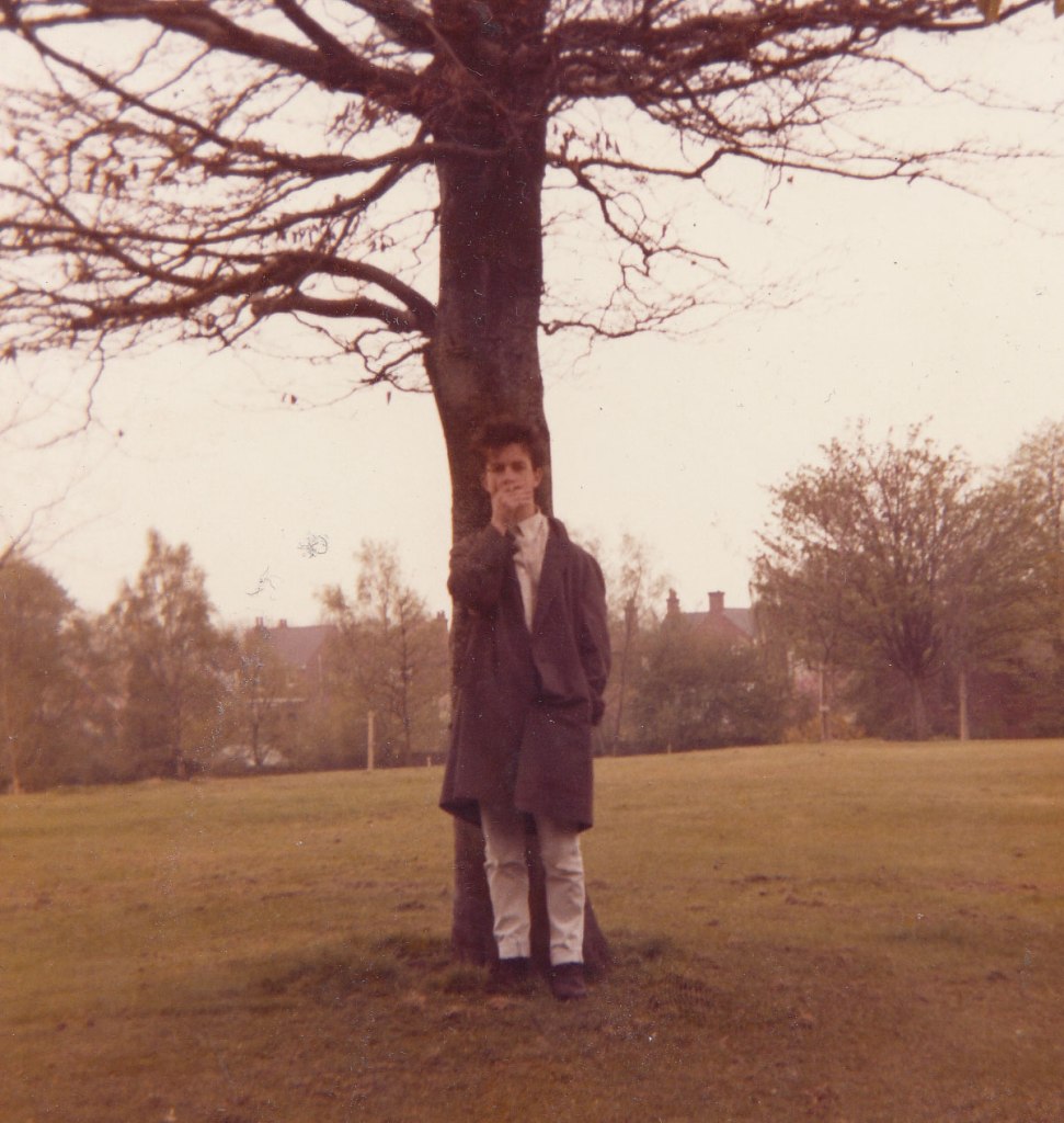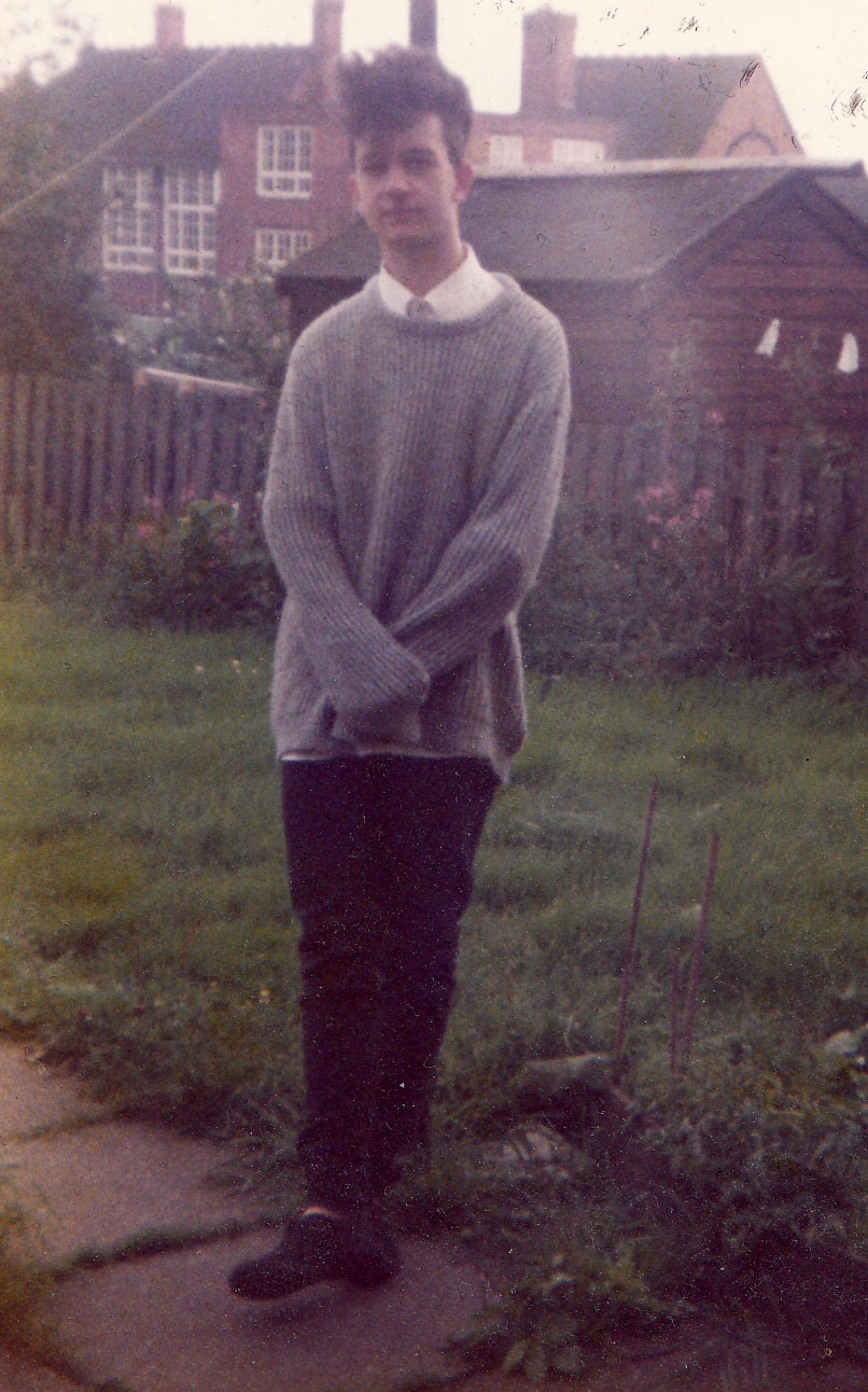 As Marc Almond had inadvertently put me in touch with my, not so much feminine side but a decidedly non-macho image, being exposed to The Smiths for the first time in 1983 saw my wardrobe take a turn for the worst. Or was it for the better? From thereon, until well into the ’90s, much to my mother’s chagrin, I only bought clothes at charity and thrift shops. My grey rain coat (historically associated with followers of Joy Division and Cabaret Voltaire), taken up above the knee (for reasons I’ve long since forgotten), shared my shoulderless frame with oversized shirts and cardies, skinny-fit black jeans. In the Summer, plimsolls (or “plimps”); in the Winter, black monkey boots. My hair, naturally curly, stiffened into a quiff by Silvikrin spray (the mere whiff of it now takes me straight back to that time), sometimes as daring as Morrissey’s exaggerated clifftop drop (see photos below). My friends, a closely-knit circle of four, wore variations on the same, to the extent that we could swap clothes and no-one would be any wiser as to who actually owned what. Mothballed “dead man’s cardigans” kept us warm through the Winter, as did army surplus-bought mesh scarves and Arctic white gloves.